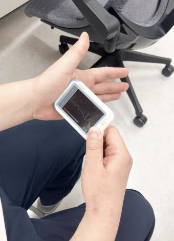 症状が強い場合や回数が多い時は心電計を用いて診断と不整脈の頻度の評価を行います。心電計は2種類あります。1つ目は携帯型心電計です(下図)。症状が出た時に心電計を手あるいはお腹に当てご自身で心電図を取っていただくことができます。毎日は起きないが、持続時間が長い時はこちらの機器を用いています。2つ目はホルター心電図です。クリニックで心電計を付けて帰宅いただき、24時間心電図を記録します。当クリニックでは症状が比較的頻回に起きる方で用いています。